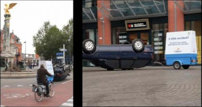 荷蘭Ogilvy所作的戶外廣告,Allsecur 是一家汽車保險公司,路上這台汽車後方拉著的小拖車##ReadMore##寫著廣告訊息;"發生小意外嗎?如果你投保的是Allsecur,那麼你將不必付半毛錢",其實這樣的狀況何止是小車禍,目的當然是為了引人注意,但更厲害的是,這台車經過改裝,下方車頂部份其實有輪子,裡頭還有人在擔任駕駛,顛倒的汽車就這樣拖著小車在市區裡閒晃,果真吸引許多人的注意。
